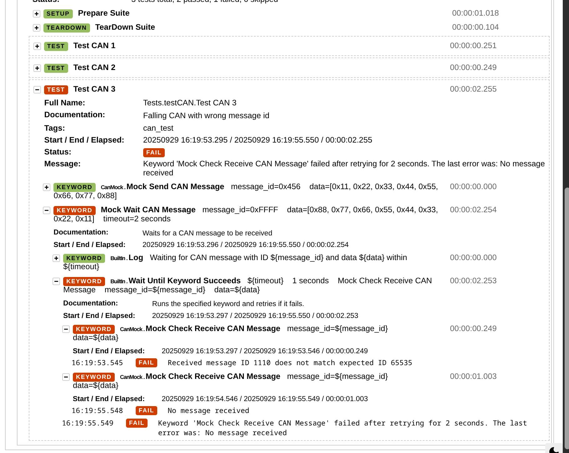 Keyword 'Mock Check Receive CAN Message' failed after retrying for 2 seconds. The last error was: No message received